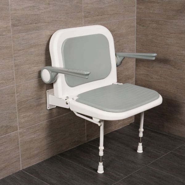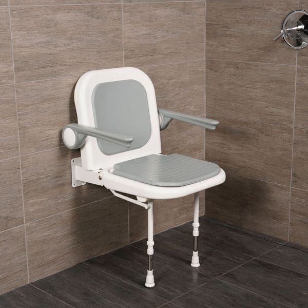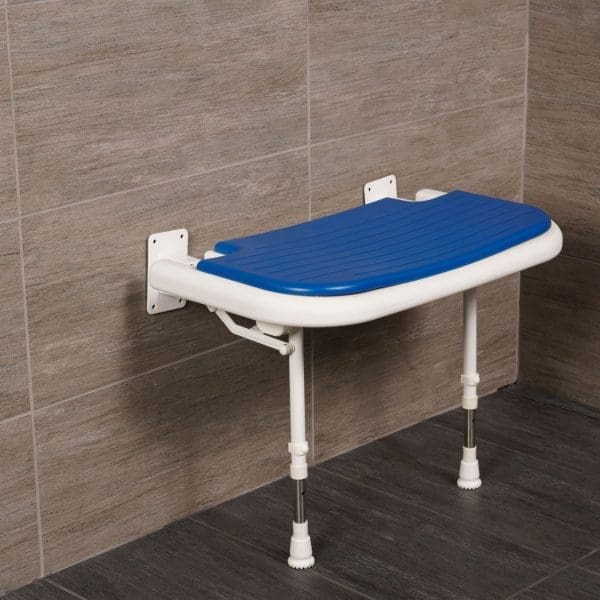 - attractive wood slatted shower seat that is slightly less than 19″ wide